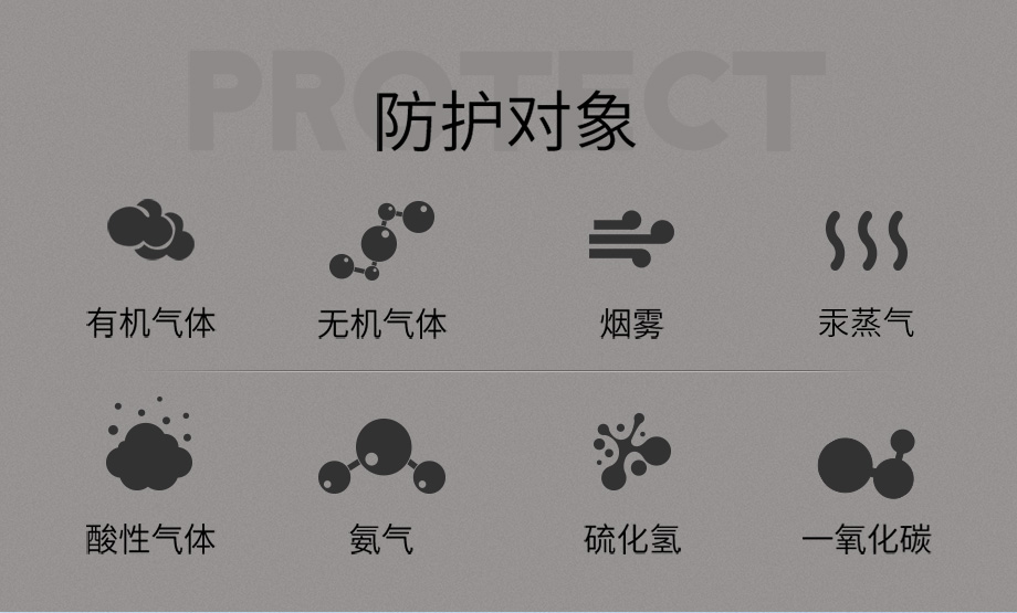 防護(hù)范圍:主要防護(hù)有機(jī)、無機(jī)氣體、酸性氣體、氨氣、硫化氫、汞蒸氣、一氧化碳及煙霧