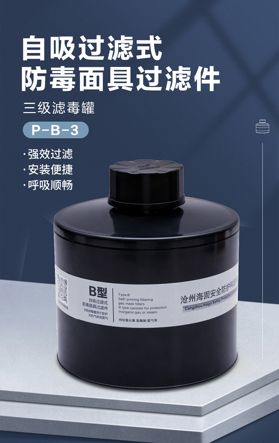 海固P-B-3濾毒罐 防護氯化氫、氫氰酸、氯氣等無機氣體三級濾毒罐