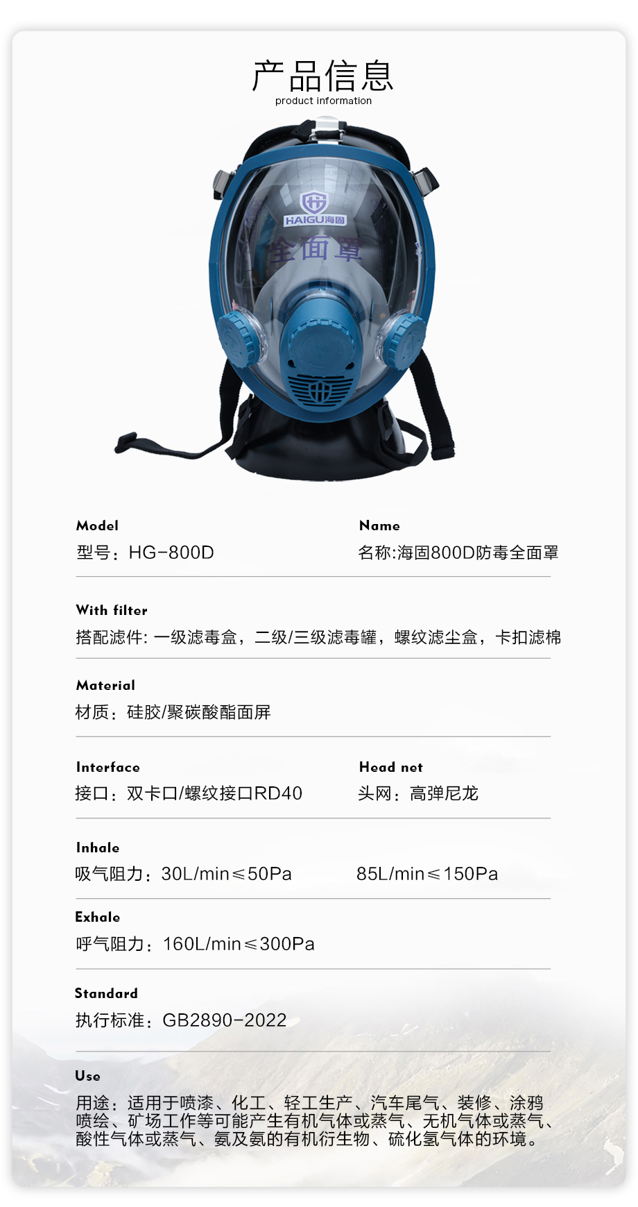 海固800D全面罩+D-A/B/E/K/H2S-3濾毒罐 綜合防毒氣套裝